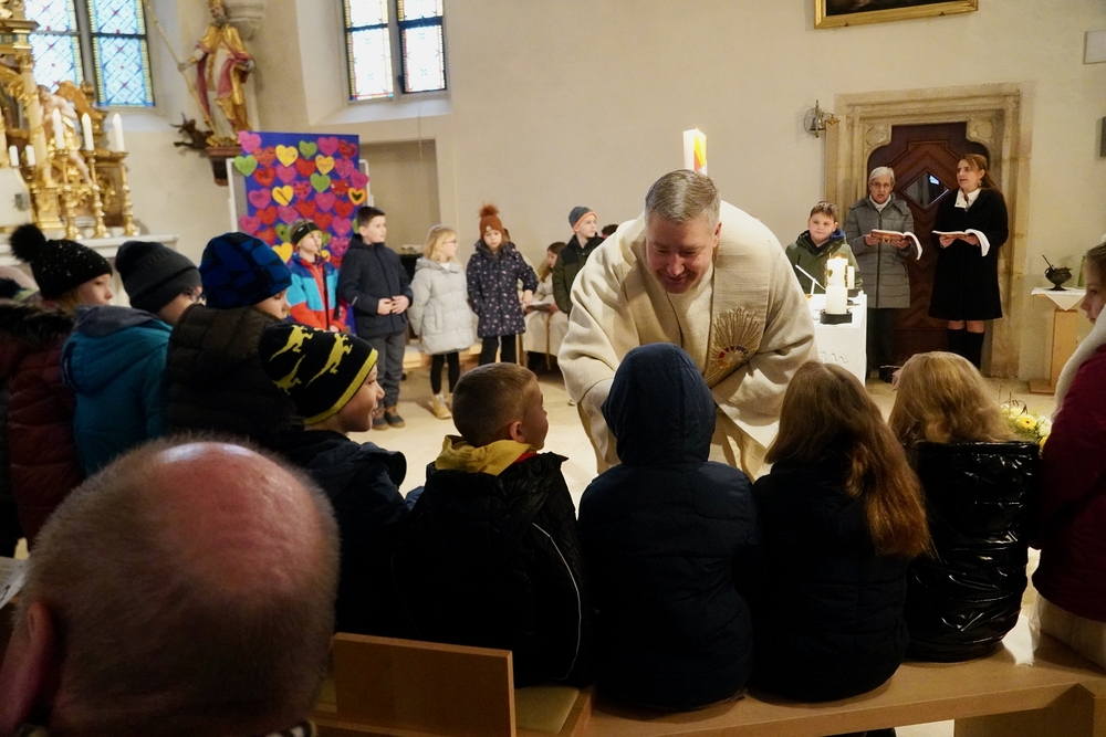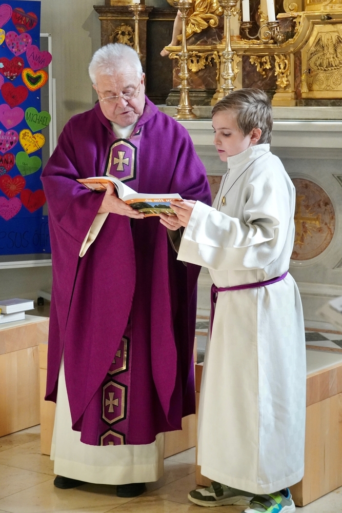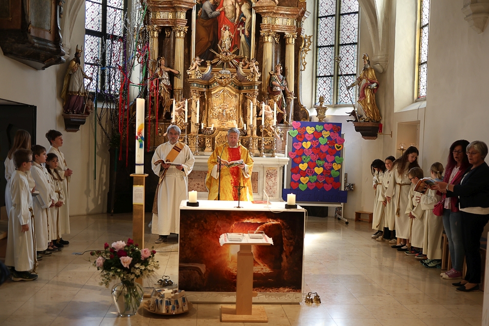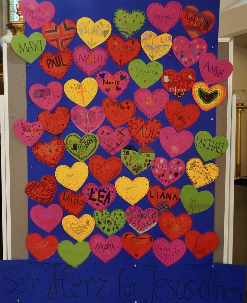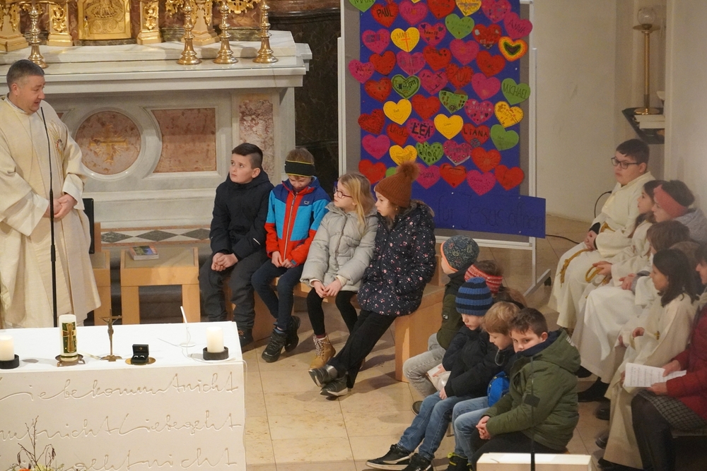Als Lichtbringer- und Zukunftsbringer für die Pfarre sprach Pfarrer Claudiu Budau in seiner Predigt alle Erstkommunionkinder an. „Ihr seid unsere Hoffnung! Durch euch kommt Freude in die Welt!“ Die Geschichte in der Lesung erzählte von einem Kind auf der Suche nach einem goldenen Stern. Es durfte erfahren, dass es diesen Stern in seinem Herzen trägt. Eine ganze Pinnwand voller Herzen, für jedes Erstkommunionkind ein Herz mit seinem Namen darauf, steht nun bis zur Erstkommunion in unserer Pfarrkirche. Religionslehrer Josef Edelsbrunner lud ein, im Zuge der Vorbereitung zur Erstkommunion einmal in die Kirche zu kommen, ev. eine Kerze anzuzünden und mit oder für ein Erstkommunionkind zu beten.