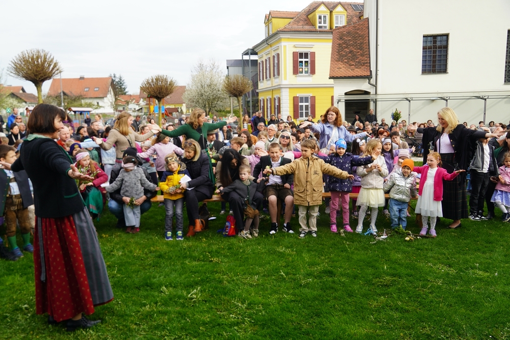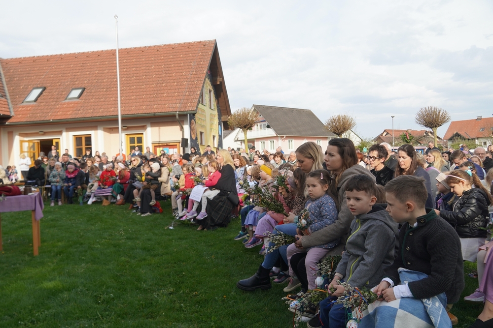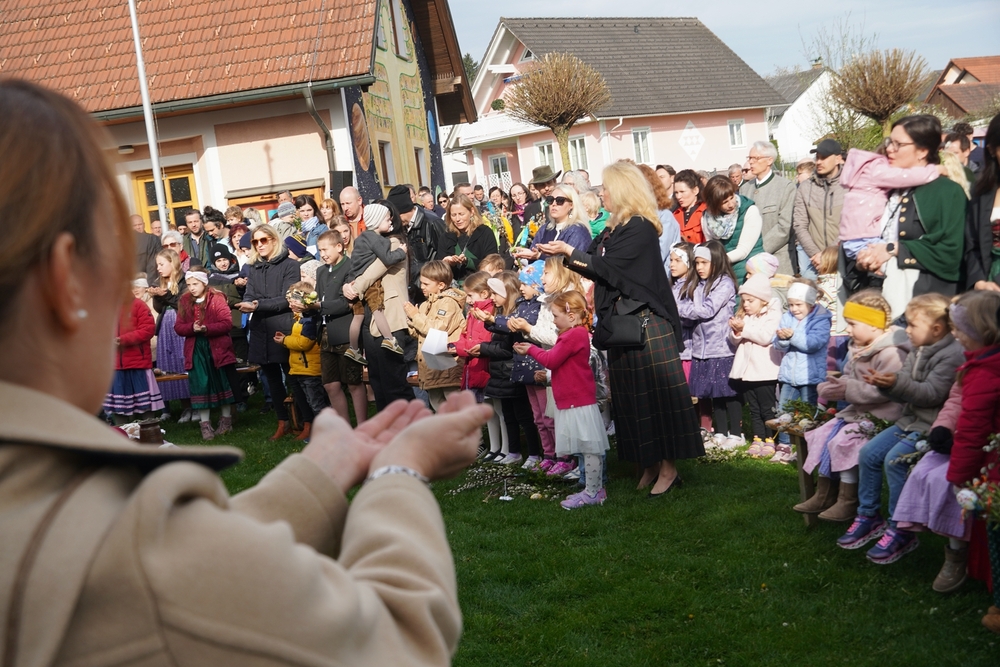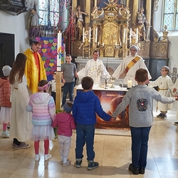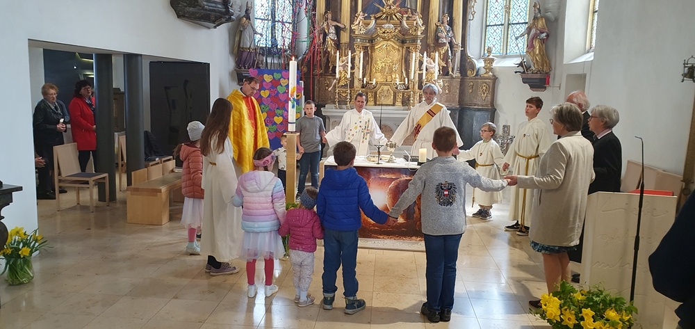 So wurde in einem festlichen Gottesdienst mit Pfarrer Friedrich Trstenjak des Einzuges Jesu in Jerusalem gedacht und von den Minis und weiteren Kindern die Leidensgeschichte vorgetragen. Symbole verdeutlichten dabei das Geschehen, sodass auch die Aufmerksamkeit der Kleinen geweckt wurde. Die zahlreichen Kindergartenkinder schwenkten ihre bunten Palmbuschen und freuten sich, „ihre Lieder“ mitzusingen und mitzuzeigen.