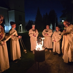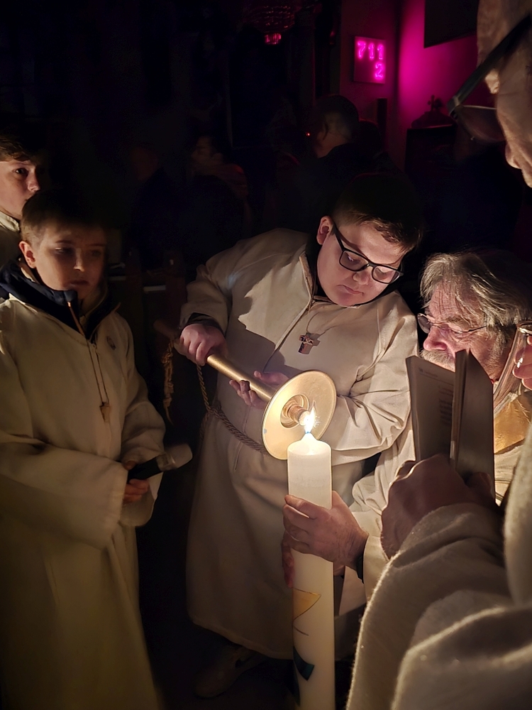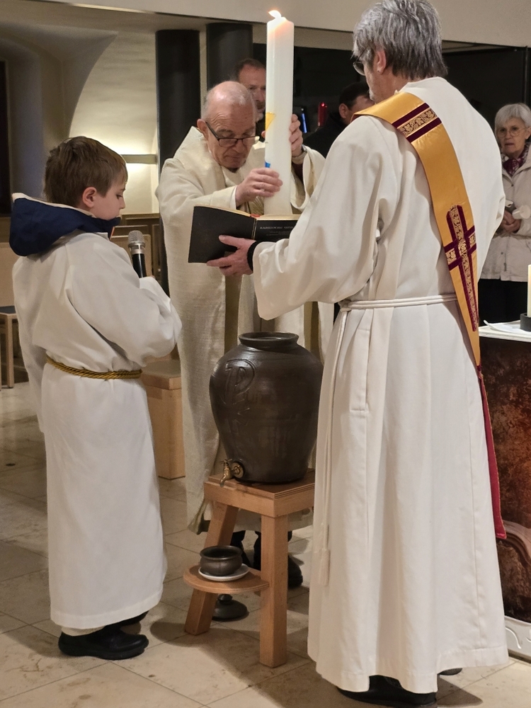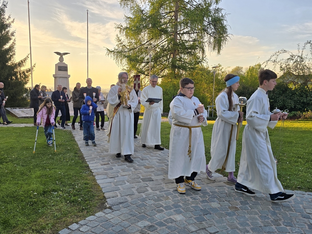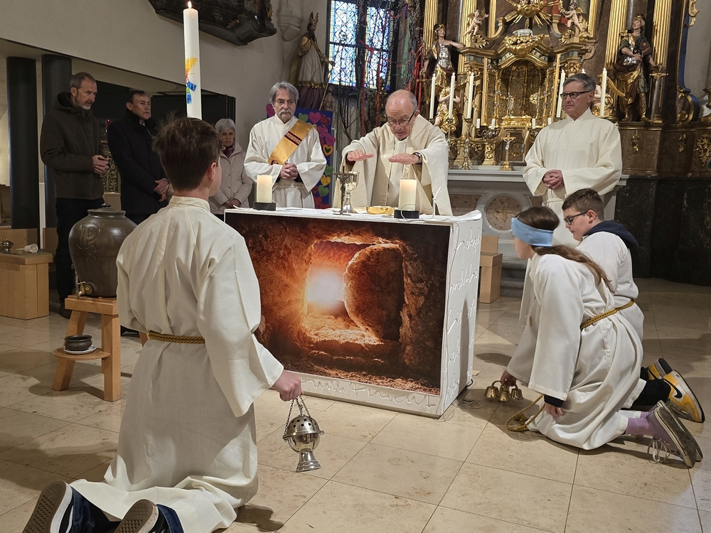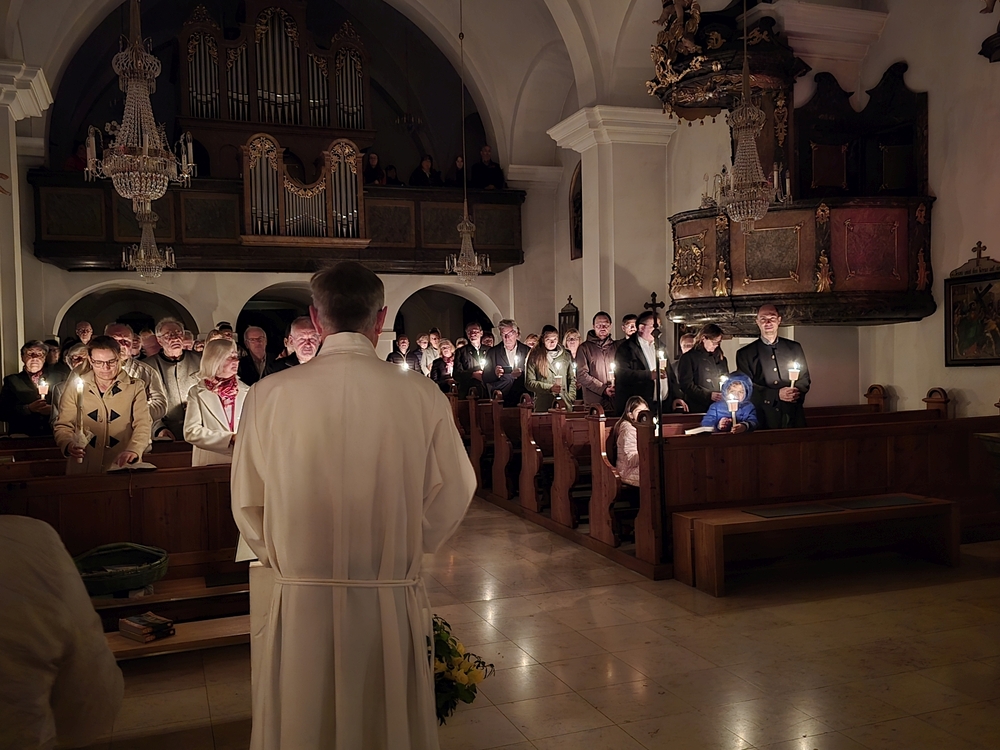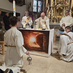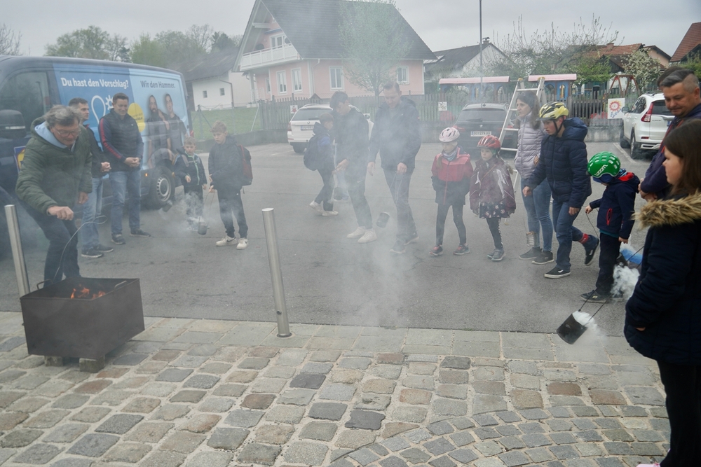 Mit der traditionellen Feuerweihe begann um 8 Uhr morgens der Karsamstag, der Tag der Grabesruhe Jesu. Diakon Michi Zepf segnete das Feuer, das die Buben und Mädchen danach in ihren Behältern in die Häuser brachten, um ordentlich zu räuchern.