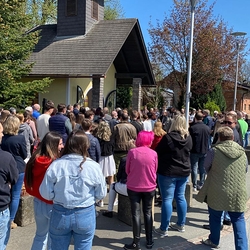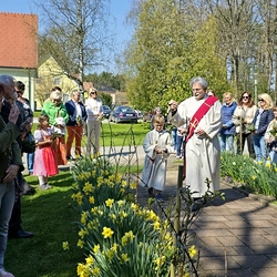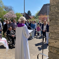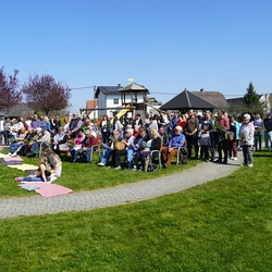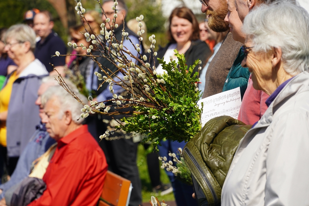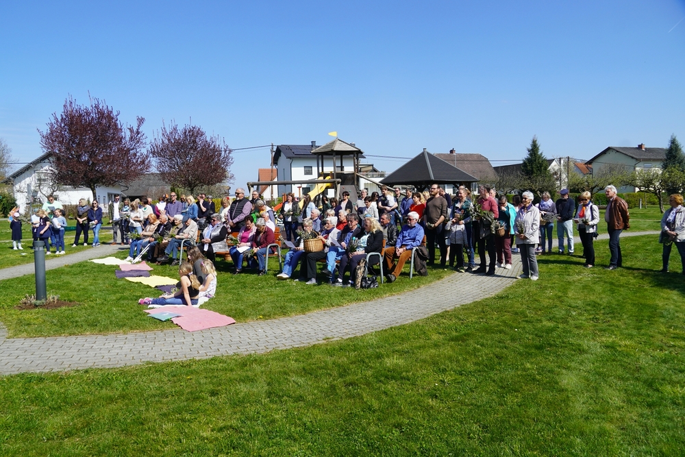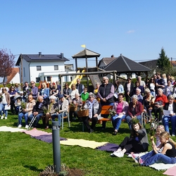 Am Palmsonntag lud strahlendes Wetter zum Feiern auf dem Kirchplatz ein. Trotz der frühen Morgenstunde musste niemand frieren, da sich die Sonne von ihrer freundlichsten Seite zeigte - ein Geschenk Gottes!
