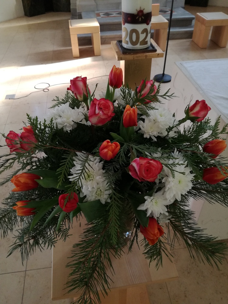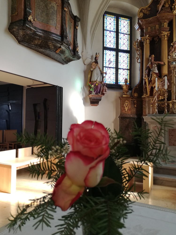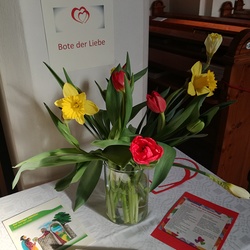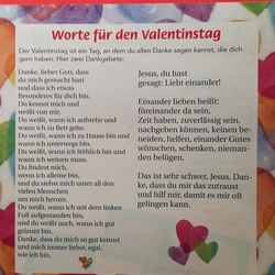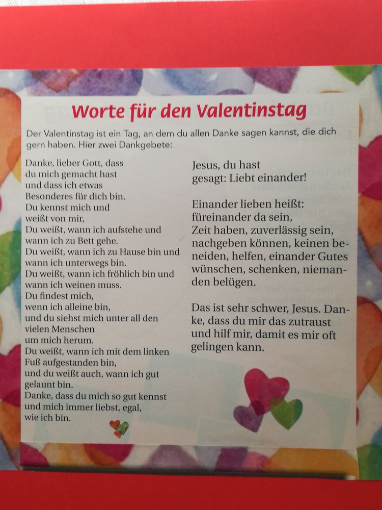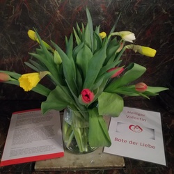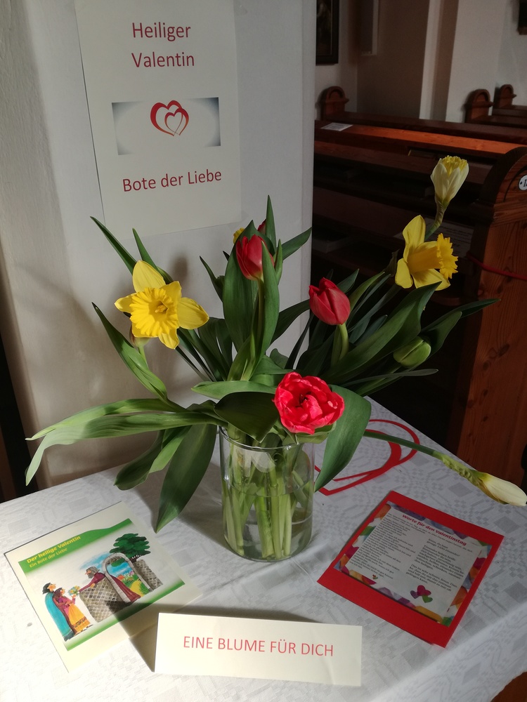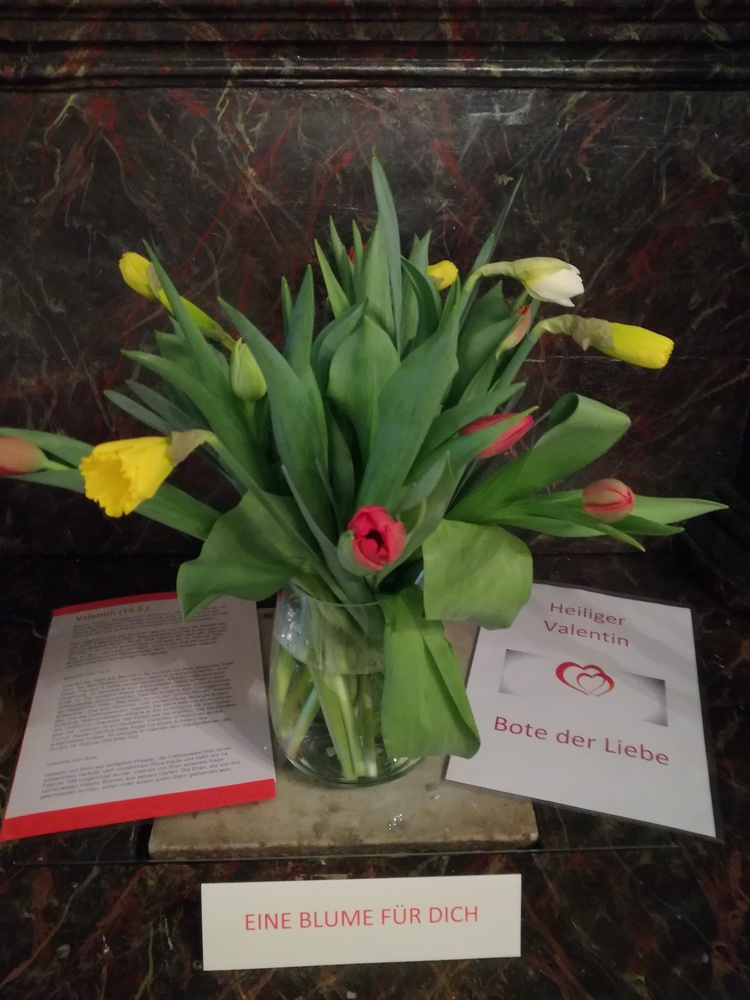 Dazu gab es noch einige Informationen zum heiligen Valentin von Terni, dessen Statue ja auch in unserer Kirche im Altarraum steht. Seine Idee, mit dem Verschenken von Blumen lieben Menschen eine Freude zu bereiten und Zuneigung auszudrücken, ist heute genauso wertvoll wie damals im 3. Jahrhundert.