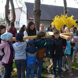Jedes Kind durfte ein eigenes kleines Holzkreuz den gesamten Kreuzweg selbst mittragen. Bei jeder der fünf Stationen konnten die Kinder ihr Schlüsselanhänger-Kreuz kreativ aufwerten. Dafür wurden passend zur Geschichte rund um Jesus und Ostern die vier Jungscharfarben Rot, Gelb, Grün und Blau miteingearbeitet. Der Grundgedanke des Kinderkreuzwegs war es, die Kinder selbst Jesus sein zu lassen. Dies konnte mit Hilfe der verschiedenen Sinne erlebt werden. Abschließend durften die Kinder passend zur Auferstehung das Holzkreuz mit frischen Blumen bekleben und Kresse, als Symbol des Lebens, säen.