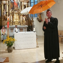 Mit dem Begrüßungssatz „Heute gießt der liebe Gott die Blumen!“, zauberte Vikar Gerhard Hatzmann – in Anspielung auf das Regenwetter – allen großen und kleinen Menschen in unserer Pfarrkirche ganz schnell ein Lächeln ins Gesicht. Eine wunderbare, fröhliche Erntedankfeier folgte.