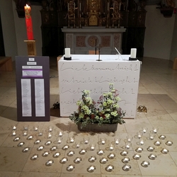Beim Allerseelengottesdienst gedachten wir all unserer Verstorbenen. Für die im letzten Jahr Verstorbenen unserer Pfarre, deren Namen nochmals vorgelesen wurden, brannten 59 Teelichter. Die 60. Kerze wurde für alle ungenannten Verstorbenen entzündet. Das „Lichtermeer“ vor dem Altar verweist hoffnungsvoll auf das Licht der Auferstehung für unsere lieben Verstorbenen!