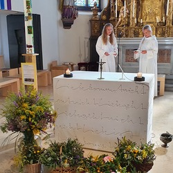 Sie sind wieder da, unsere Ministrantinnen und Ministranten! Und das freut uns alle sehr! Beim Erntedankfest versahen sie zahlreich ihren Dienst am Altar, ein wunderbares Bild!